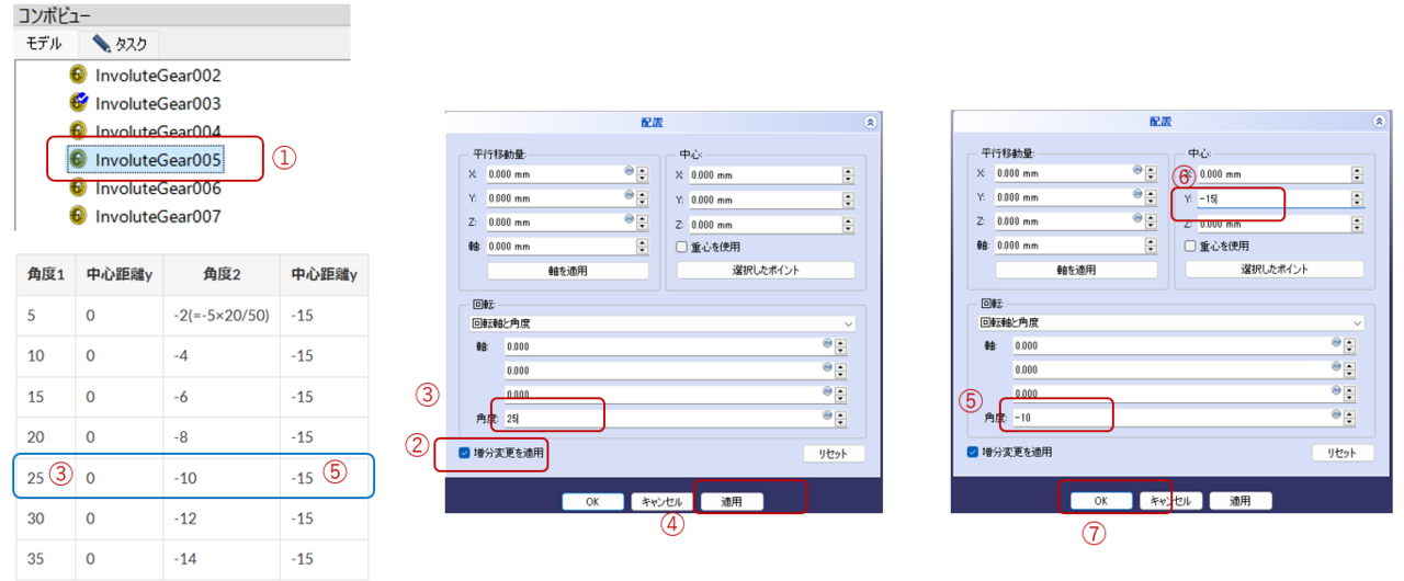 - 角度にパラメータ表の3列目「-2」、中心距離Yにパラメータ表4列目「-15」を入力。これが2回目の変換で内歯車軸マイナス2°回転です。